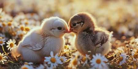 adorable chickens and cute bunnies kissing each other in a field of daisies.