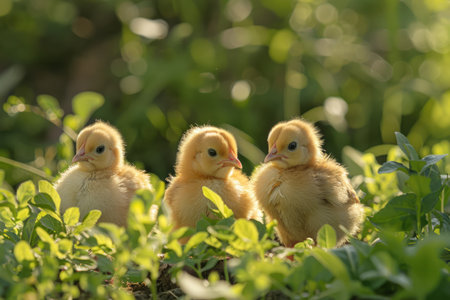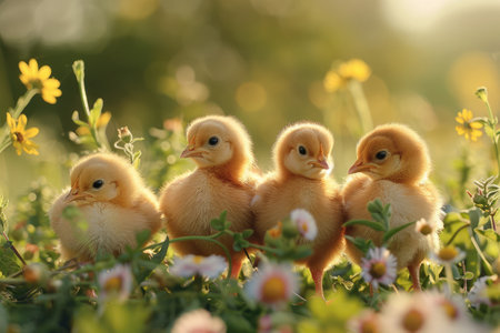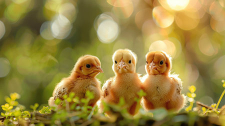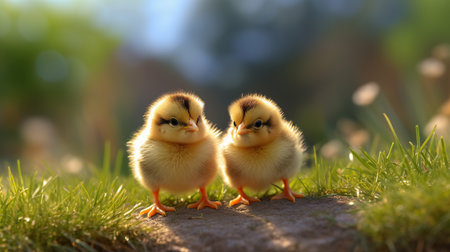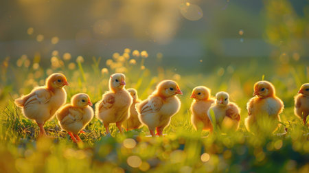 Cute baby chicks exploring a sunny field of grass, their soft feathers highlighted by the warm sunlight. A perfect spring day scene. --chaos