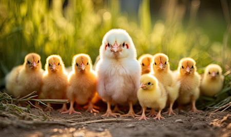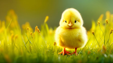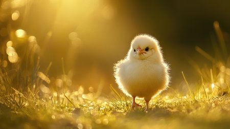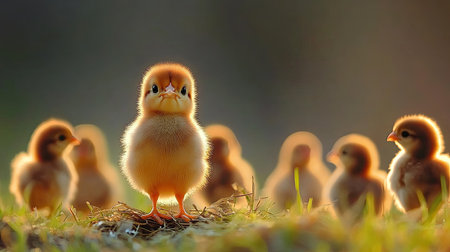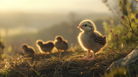 A cute chick stands proudly on a sunlit meadow, surrounded by soft light and a calm natural background. This image captures the essence of wildlife and innocence in the early morning.
