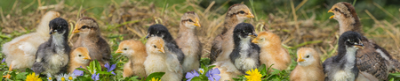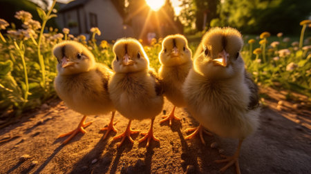 Cute yellow chicks gathered together on a warm sunny afternoon in a countryside environment