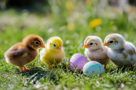 Cute chicks investigate vibrant eggs scattered on lush green grass during a bright spring day creating a joyful and playful atmosphere.