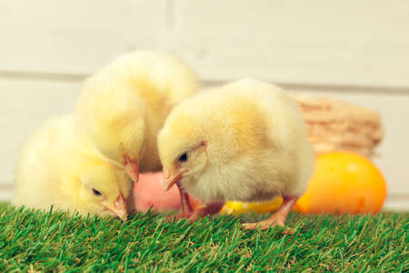 Small chickens against the background of spring nature on Easter, in a bright sunny day at a ranch in a village.