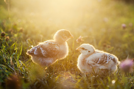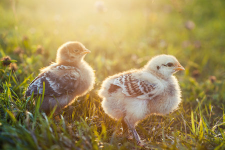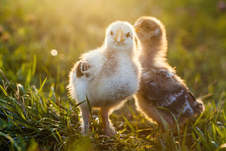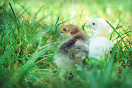 Adorable close up two little chickens on grass field or grassland on the natural sunset background