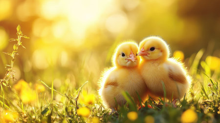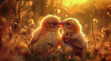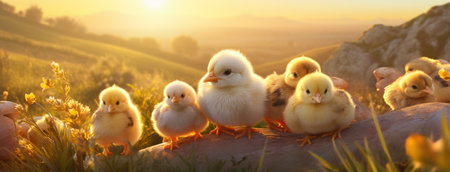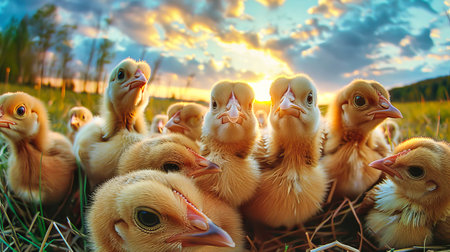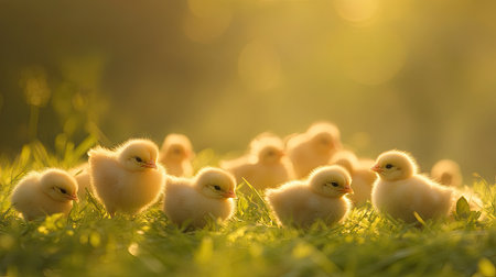 A group of fluffy, newborn chicks huddle together for warmth and comfort in the soft green grass. Bathed in the magical glow of a golden sunset, this scene captures the innocence, fragility, and beauty of new life and togetherness in the spring.