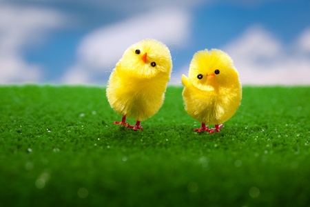 Two little chickens in the grass