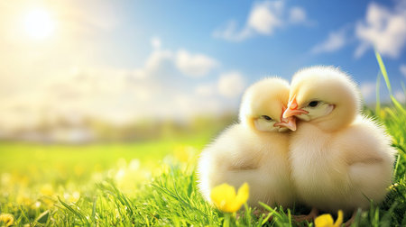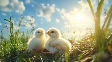 A pair of cute chicks basking in the warm sunlight on a grassy patch, with a bright blue sky in the background. Cheerful outdoor atmosphere. --chaos
