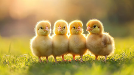 Cute little chicks standing together in a grassy field, enjoying the sunny day. Warm sunlight highlights their fluffy appearance. --chaos