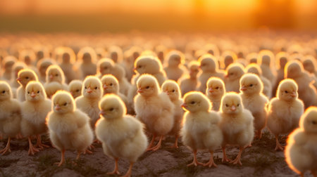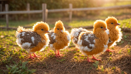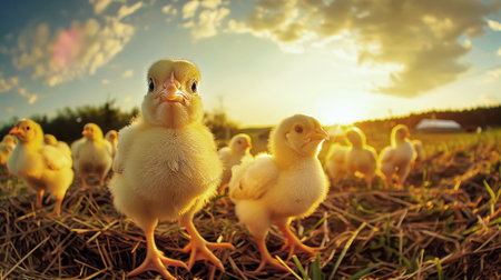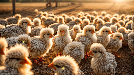 a mother hen guards her fluffy chicks in the golden sunlight, embodying the essence of organic poultry farming