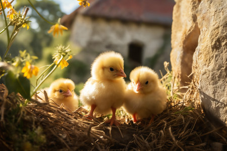 A charming scene of yellow chicks gathered on a nest, illuminated by soft natural light, showcasing the innocence and beauty of farm life in a serene environment.