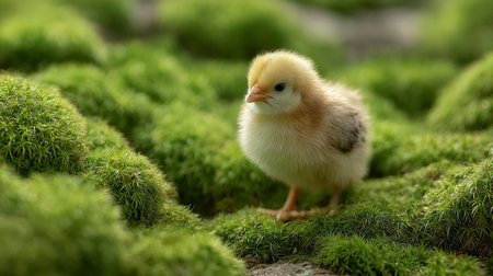chick on green moss background with copy space for text or image