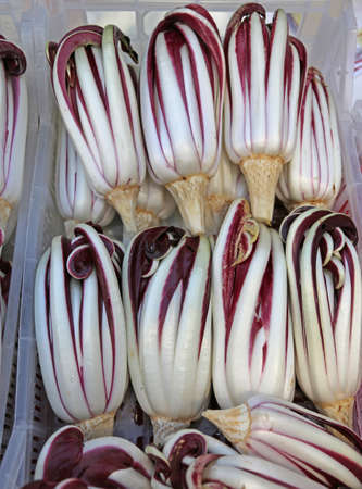 Many red chicory also called RADICCHIO TARDIVO in Italian Language for sale at greengrocer shop