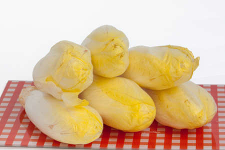 Fresh organic Belgian endivi or bitter green and red chicory lettuce close up