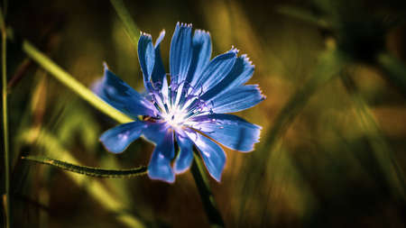Close-up of chicory flower in the meadow lit by the summer evening sun
