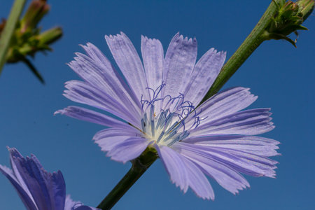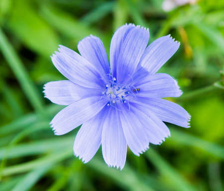 beautiful blue chicory field flower with stamens and pestle in the meadow