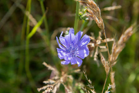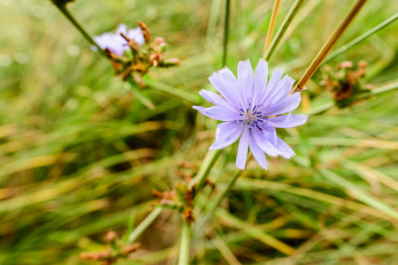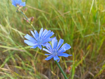 Bright blooming blue succory or common chicory (Cichorium intybus) plant flower on the meadow on green grass background. Selective focus fotography.