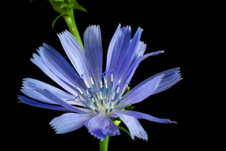 A fragment of a chicory twig on a black background. A blue flower bloomed on it. Close-up.