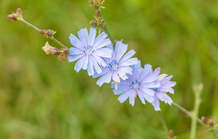 delicate blue flowers of chicory, plants with the Latin name Cichorium intybus on a blurred natural background, narrow focus area.