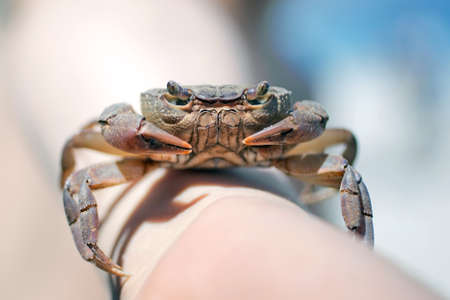 Holding crab on hand at the beach. Focus on the crab.