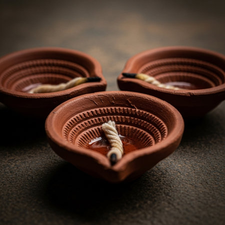Two hands cradle a clay lamp glowing warmly with a flame, showcasing intricate decorations and dirt from a festive celebration in a culturally rich setting at twilight.