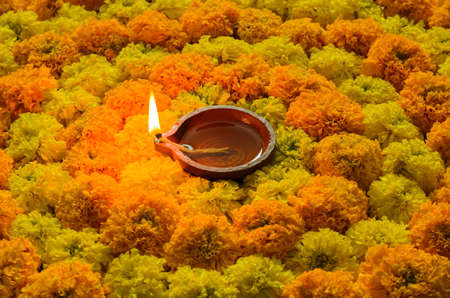 Decorative marigold flower rangoli for Diwali festival with clay diya lamp lit with flame.