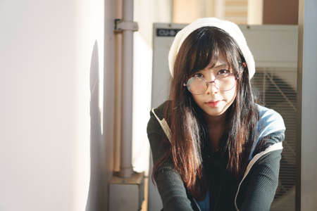 Portrait of charming Asian girl with hat and glasses in film tone style