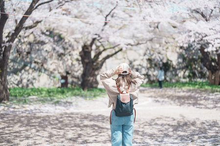 Woman tourist sightseeing Sakura Cherry blossom at Morioka Castle Ruins park in Spring, happy traveler travel in Iwate Park, Iwate prefecture, Japan. famous Landmark Travel and Vacation destination