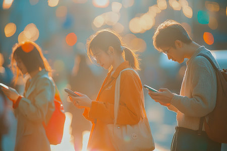 People Engaged With Smartphones on a Busy Urban Street During Golden Hour