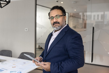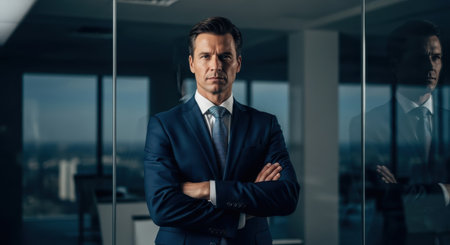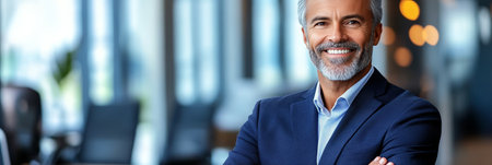 A joyful and confident mid-aged senior business executive is seen standing in a sleek modern office, radiating professionalism, leadership qualities, and experience, ideal for business success