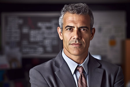 This captivating image presents a portrait of a beautiful mature Hispanic business man standing confidently in front of an information whiteboard. With an aura of wisdom and determination, he exudes a commanding presence. The information whiteboard becomes a platform for his visionary insights and innovative ideas, as he navigates the ever-evolving landscape of the business world.
