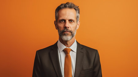mature businessman in suit and tie looking at camera isolated on orange