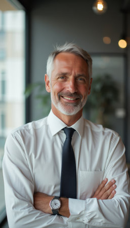 A distinguished older man with silver hair and a well-groomed beard stands confidently with his arms crossed, exuding professionalism and charm. Dressed in a crisp white shirt and a sleek black tie, he radiates a sense of experience and approachability in a modern office setting.