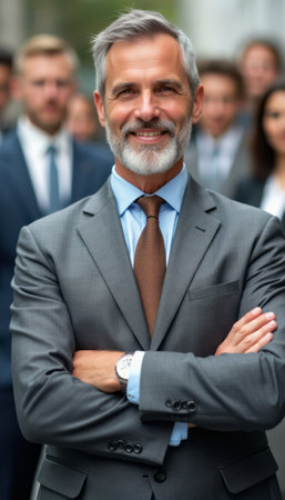 A distinguished older man with a well-groomed beard stands confidently in a tailored suit, arms crossed, exuding leadership. Behind him, a diverse group of professionals, both men and women, showcases a dynamic team atmosphere, emphasizing collaboration and success.