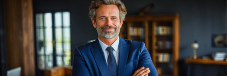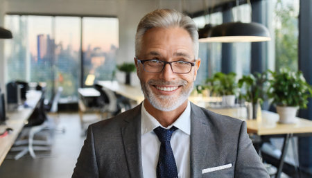 Confident Middle-Aged Professional Smiling in Sophisticated Office, Stylish Businessman Posing