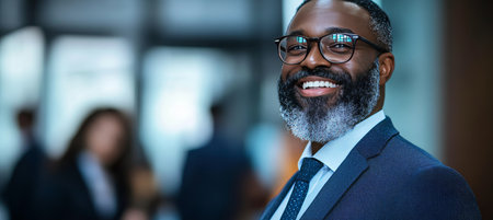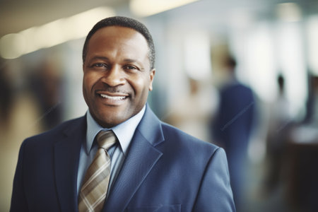 Mature smart african-american businessman, smiling face, standing in blur background of busy office. Generative AI AIG20.
