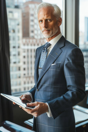 a businessman in his 50s to 60s exudes confidence and style. Dressed in a meticulously tailored, elegant suit paired with a luxurious tie, he stands with a commanding presence against a blurred office
