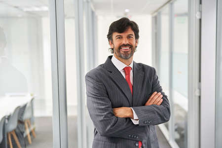 Portrait of a confident businessman with a gray beard in a suit, arms crossed, standing in an office environment, exuding leadership and professionalism.