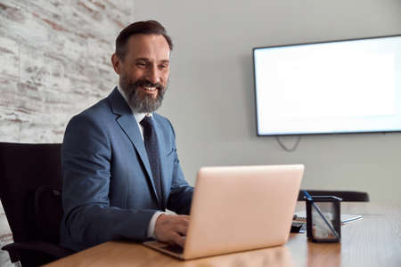 Happy adult caucasian man is working in a modern office