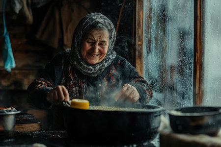 A woman prepares a meal on an old clay stove with steaming pots and traditional earthenware.