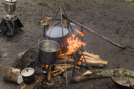 field kitchen with metal cauldron on fire