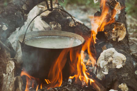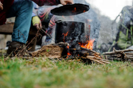 Pot with meat stew, on a fire bonfire in a tourist camp in a wild forest.