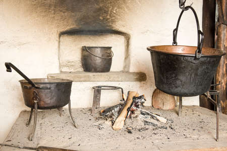 historical fire place, old cooking equipment, primitive kitchen with home interior