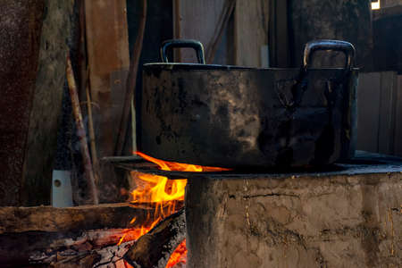 Traditional cuisine big black pot cooking food, natural fire with wood heating