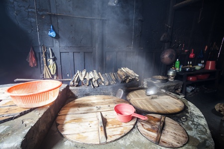 old chinese kitchen in an old village, this is a kitchen in a wooden building which has 150 years history, photo taken in Fuzhou Jiangxi province