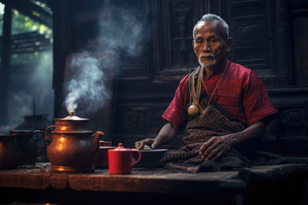 An aged gentleman peacefully sits at a table, serenely pouring himself a cup of tea, Temple chief priest doing morning duty, AI Generated