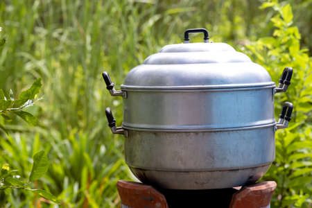 Stainless steamer on charcoal stove