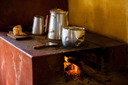 Old Alluminum kettle and bread on wood burning stove in countrified Brazil