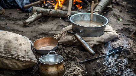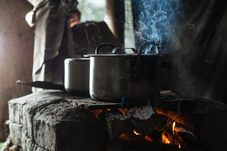 A captivating scene of traditional cooking in a rustic kitchen. Steaming pots over an open flame create an inviting atmosphere, highlighting culinary traditions.