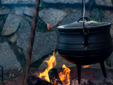 Cooking in a cast iron cauldron on a tripod over an open fire. Selective focus