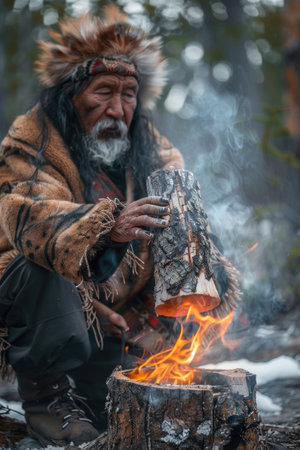 Cultural insight: portrait of a shaman, reflecting authenticity and intimate relationship with nature, spiritual healing, timeless knowledge that embodies shamanic way of life