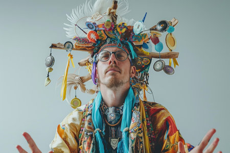 A man wearing a headpiece made of various found objects and brightly colored fabrics stands with his arms outstretched.